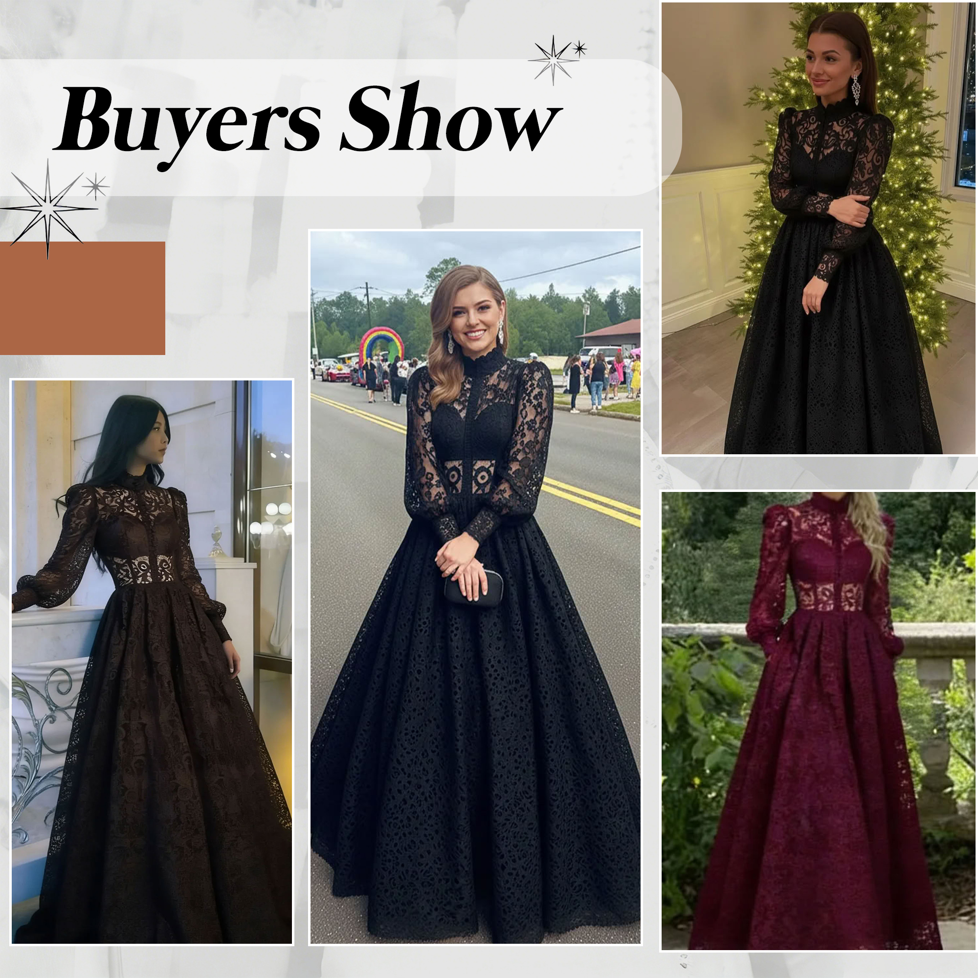 Black High Neck Long Sleeves Lace Evening Dress with Pockets
