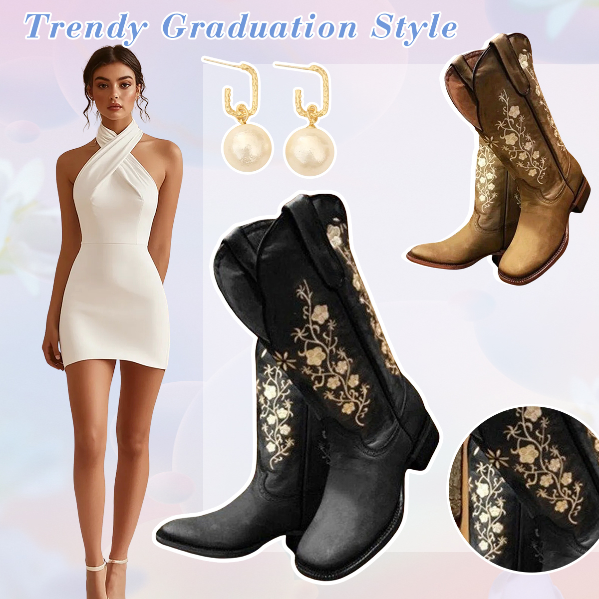 Black Thick Heel Round Toe Embroidered Women's Boots