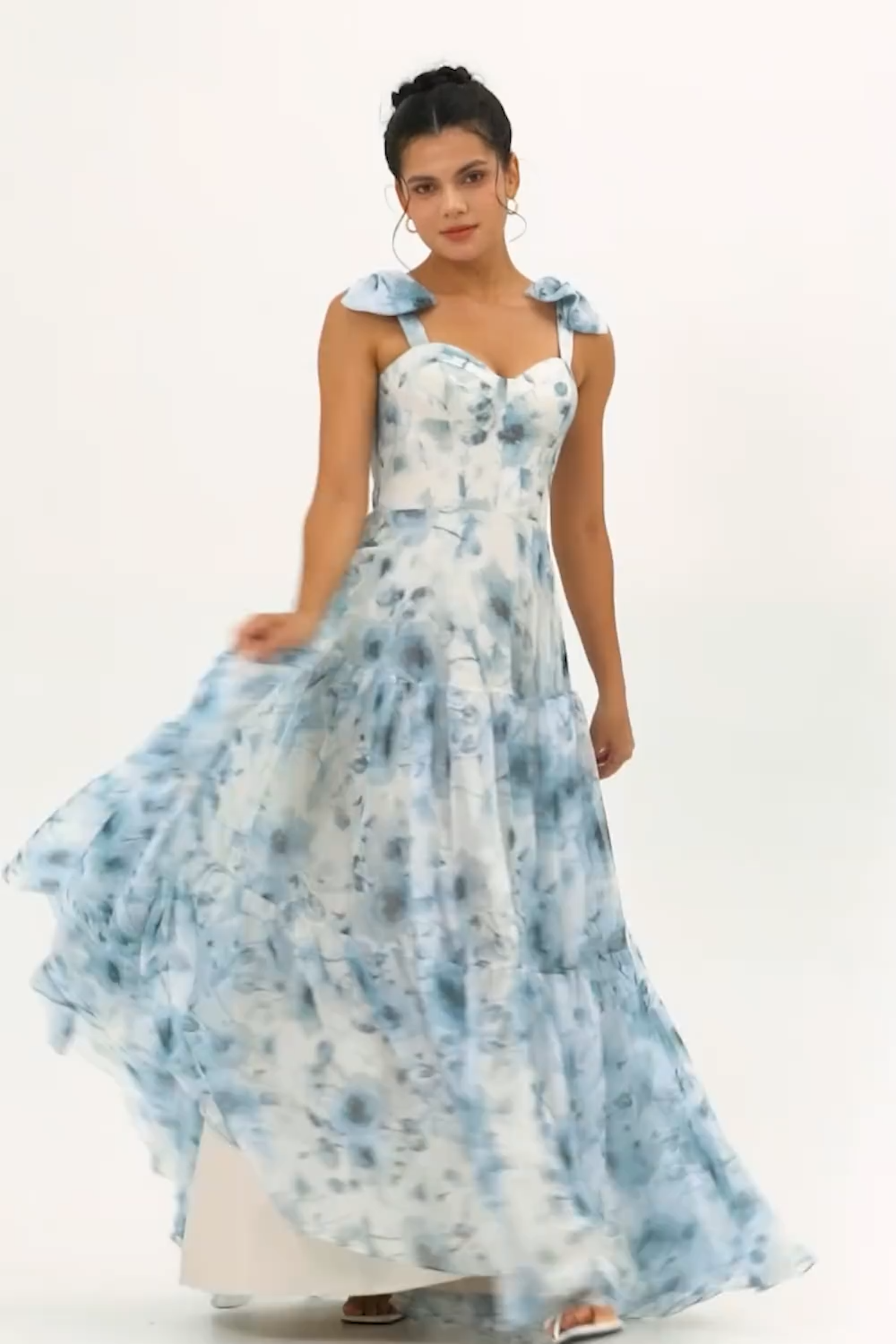 Blue Chiffon A Line Floral Long Bridesmaid Dress
