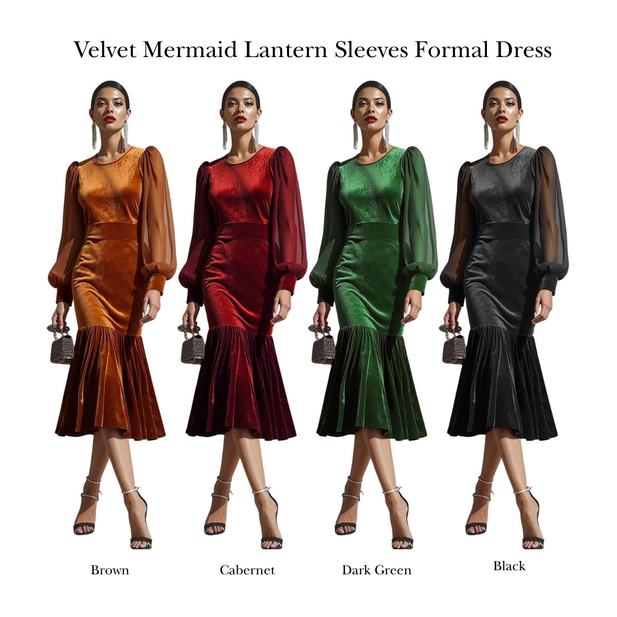 This velvet dress embodies classic sophistication with a touch of vintage drama. Crafted from rich, soft velvet, it offers a luxurious sheen and a flattering fit that hugs the curves before gracefully flaring out into a mermaid hem. The elegant lantern sleeves add volume and a romantic silhouette, balancing the sleek lines of the dress with a refined statement.