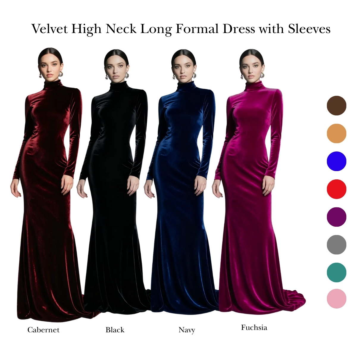 Cabernet Velvet High Neck Sweep Train Formal Dress with Sleeves