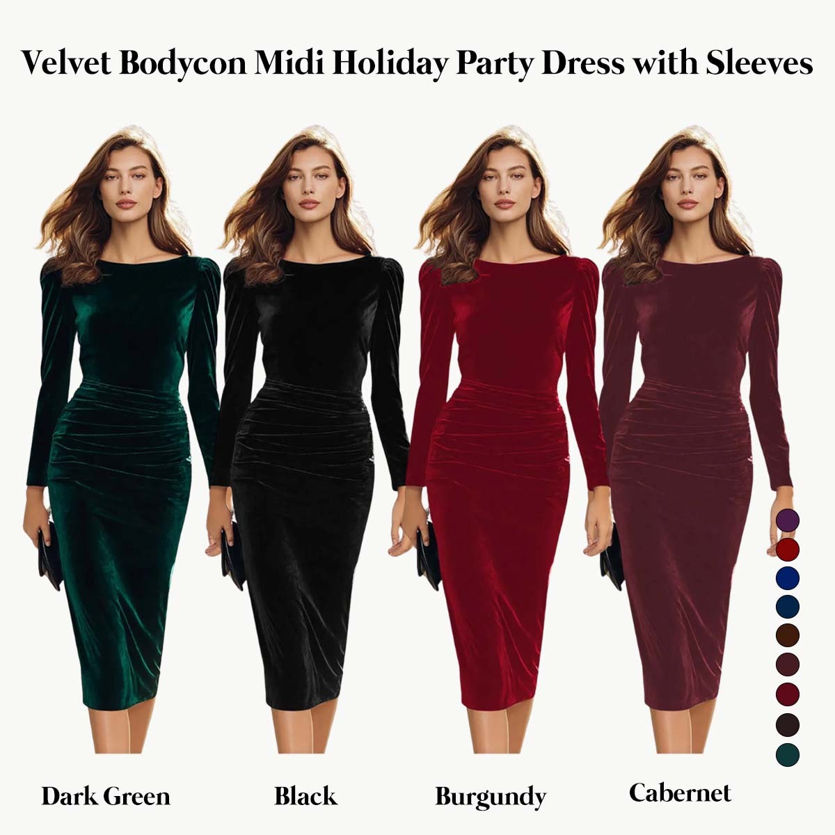 Dark Green Velvet Bodycon Boat Neck Midi Holiday Party Dress with Sleeves