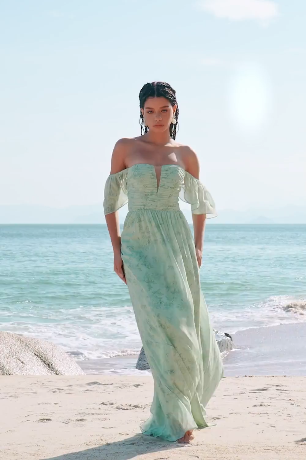 Romantic and timeless, this dress is designed for effortless elegance. Crafted from airy chiffon with delicate floral prints, it flatters with a cinched waist and a flowing skirt. The soft A-line silhouette moves beautifully, while the side slit adds comfort and a touch of allure. Its muted dusty sage hue complements various wedding themes, from garden celebrations to classic ballroom ceremonies. Ideal for spring and summer weddings, this floral chiffon gown blends charm, comfort, and sophistication, ensuring every bridesmaid looks and feels radiant.