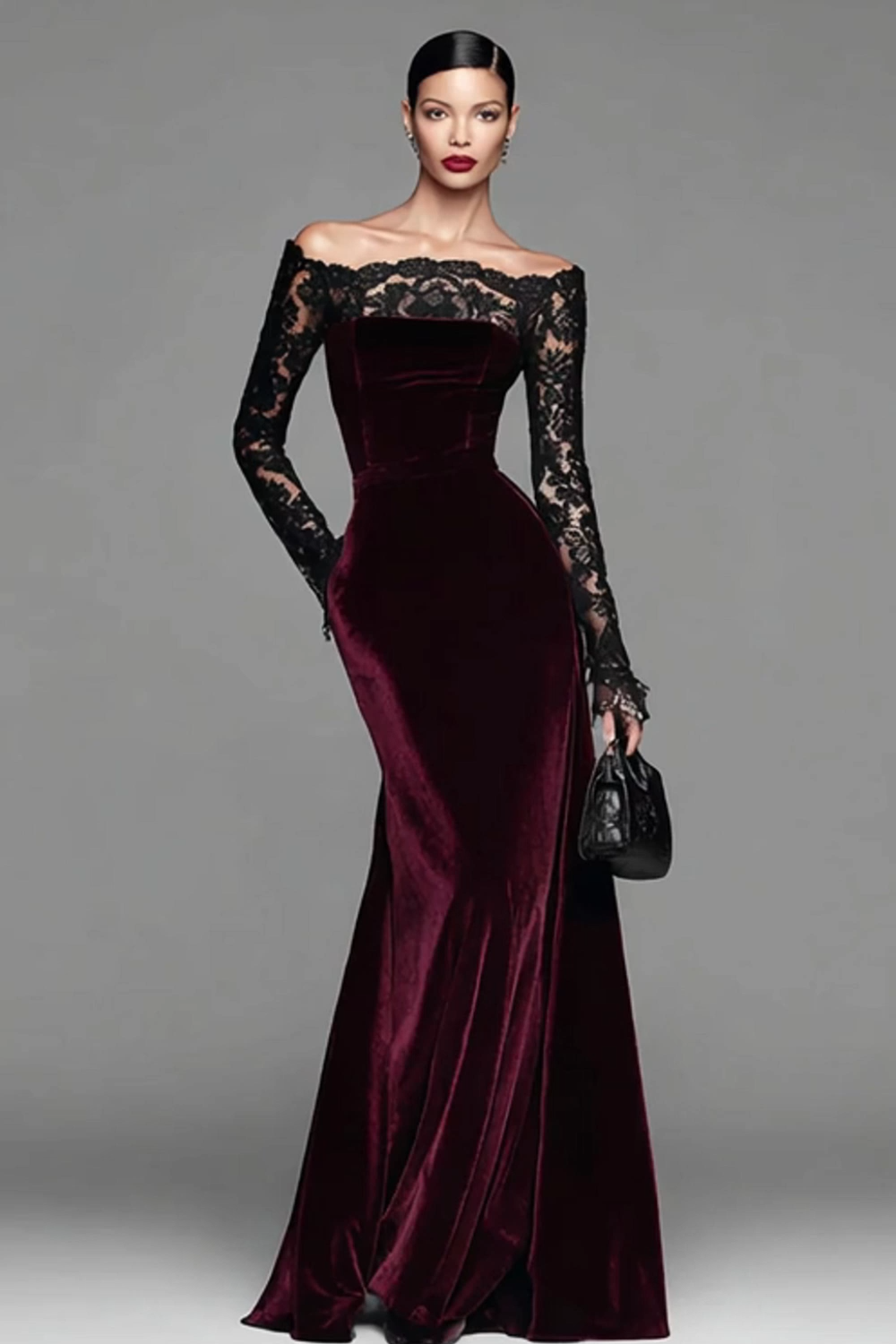 Elegant Burgundy Velvet Mermaid Long Holiday Party Dress with Lace