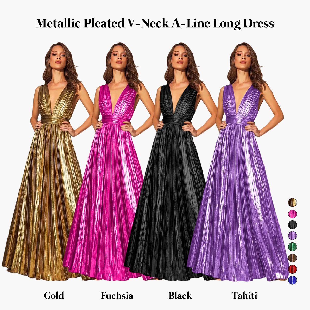Gold Metallic Pleated V-Neck A-Line Long Formal Dress