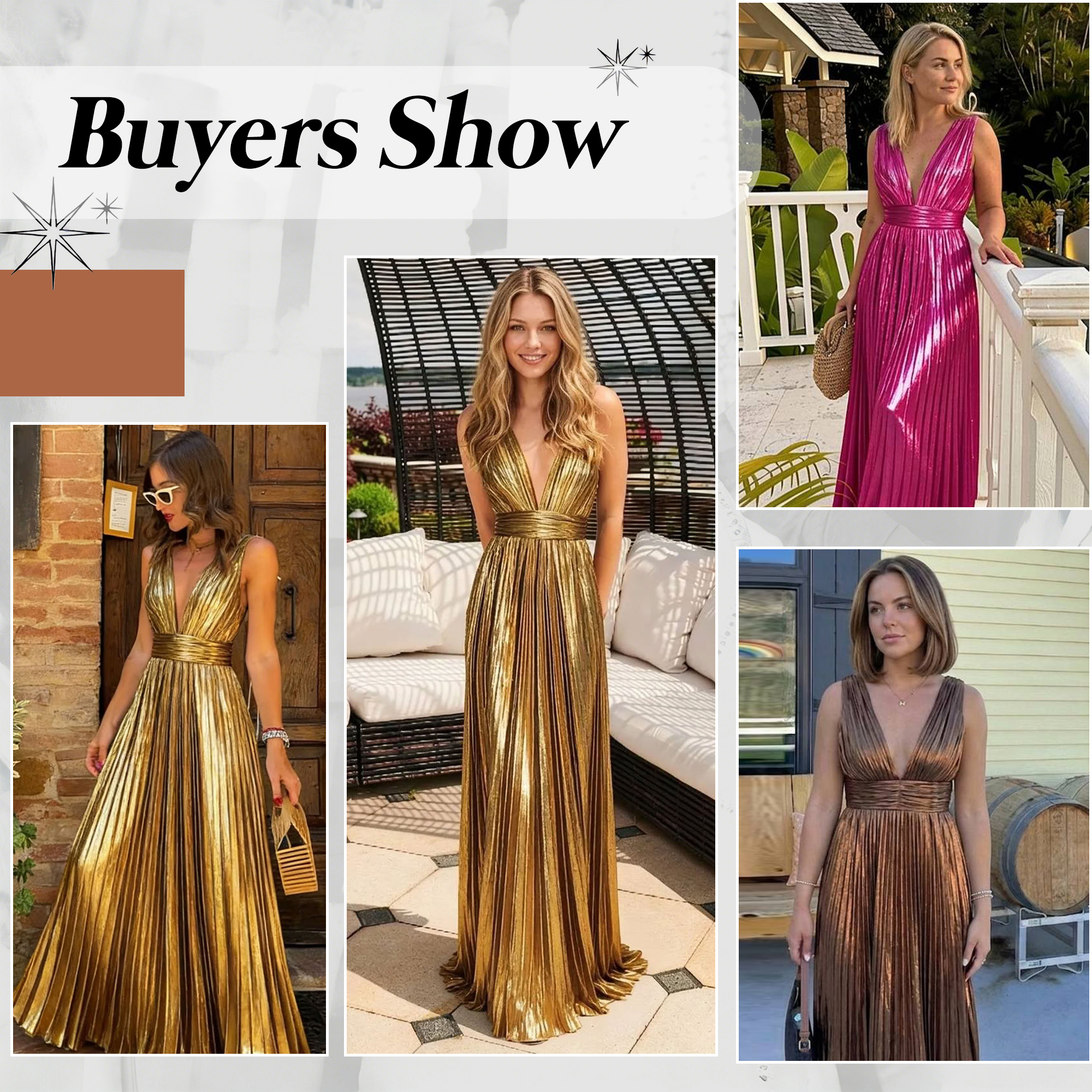 This dress radiates timeless glamour with its luminous metallic finish and elegant pleated texture. The soft pleats add movement and dimension, catching the light beautifully with every step. Perfect for formal evenings, weddings, galas, or special celebrations, this gold gown delivers a refined yet eye-catching look that feels both sophisticated and effortlessly elegant.