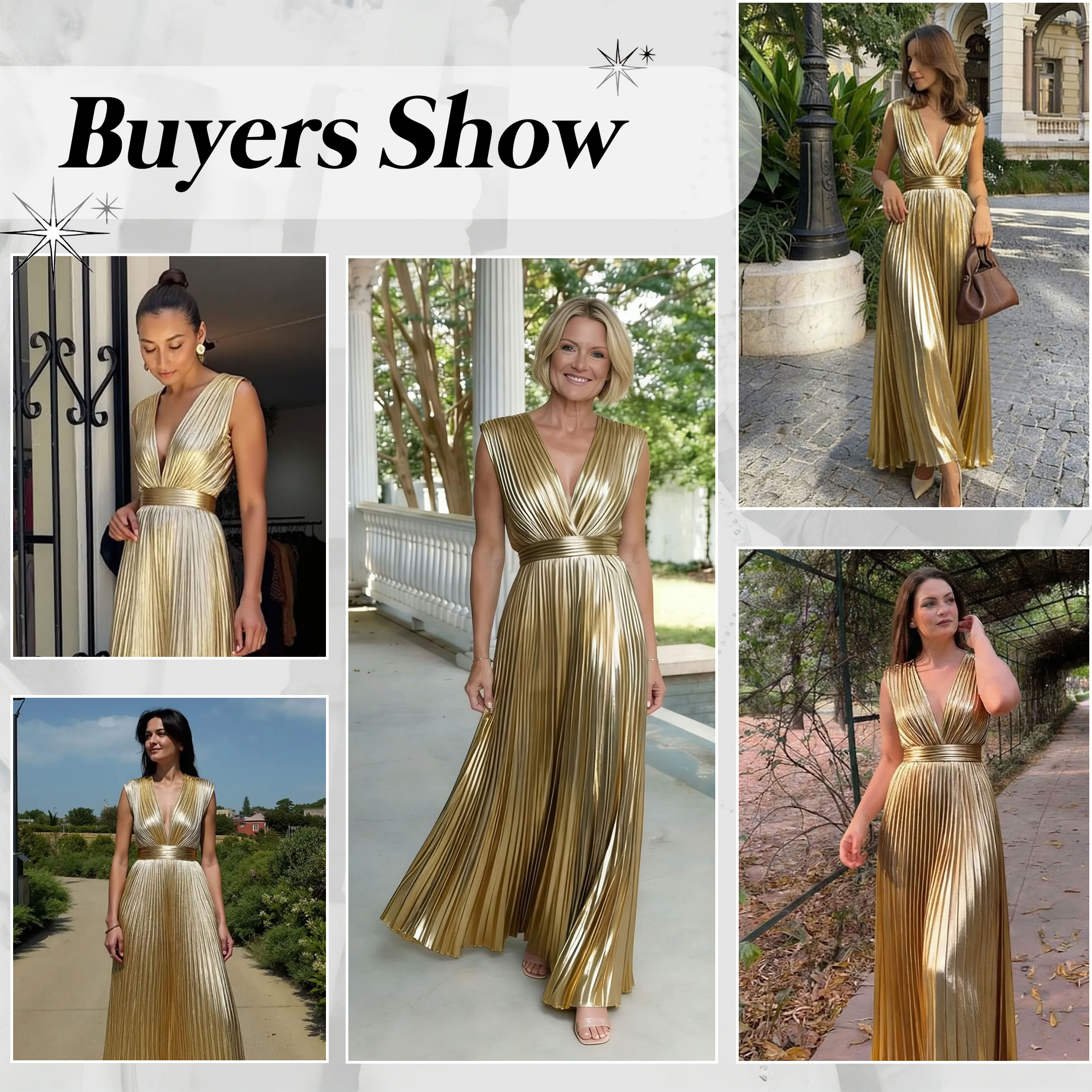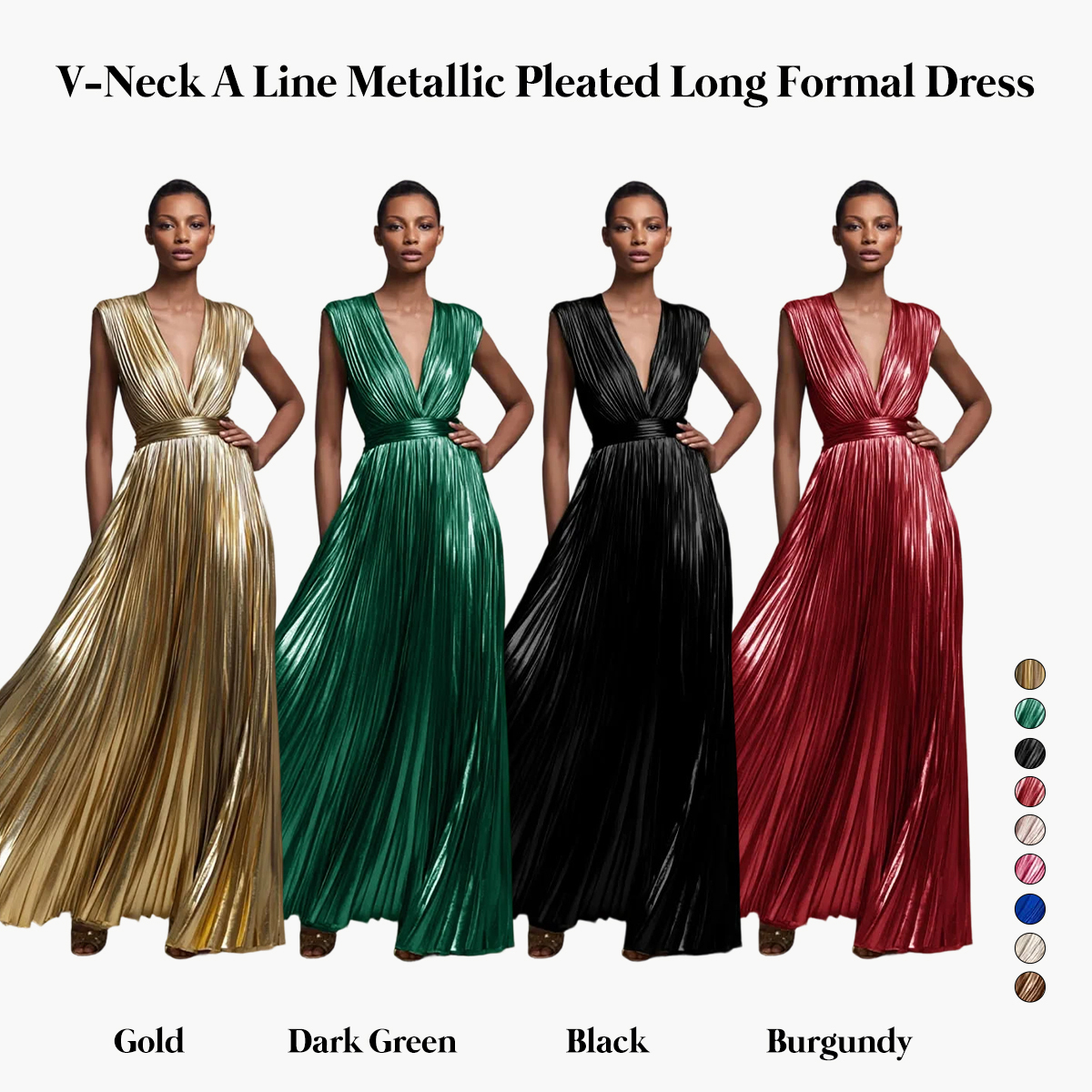 Gold V-Neck A Line Metallic High Waist Pleated Long Formal Dress