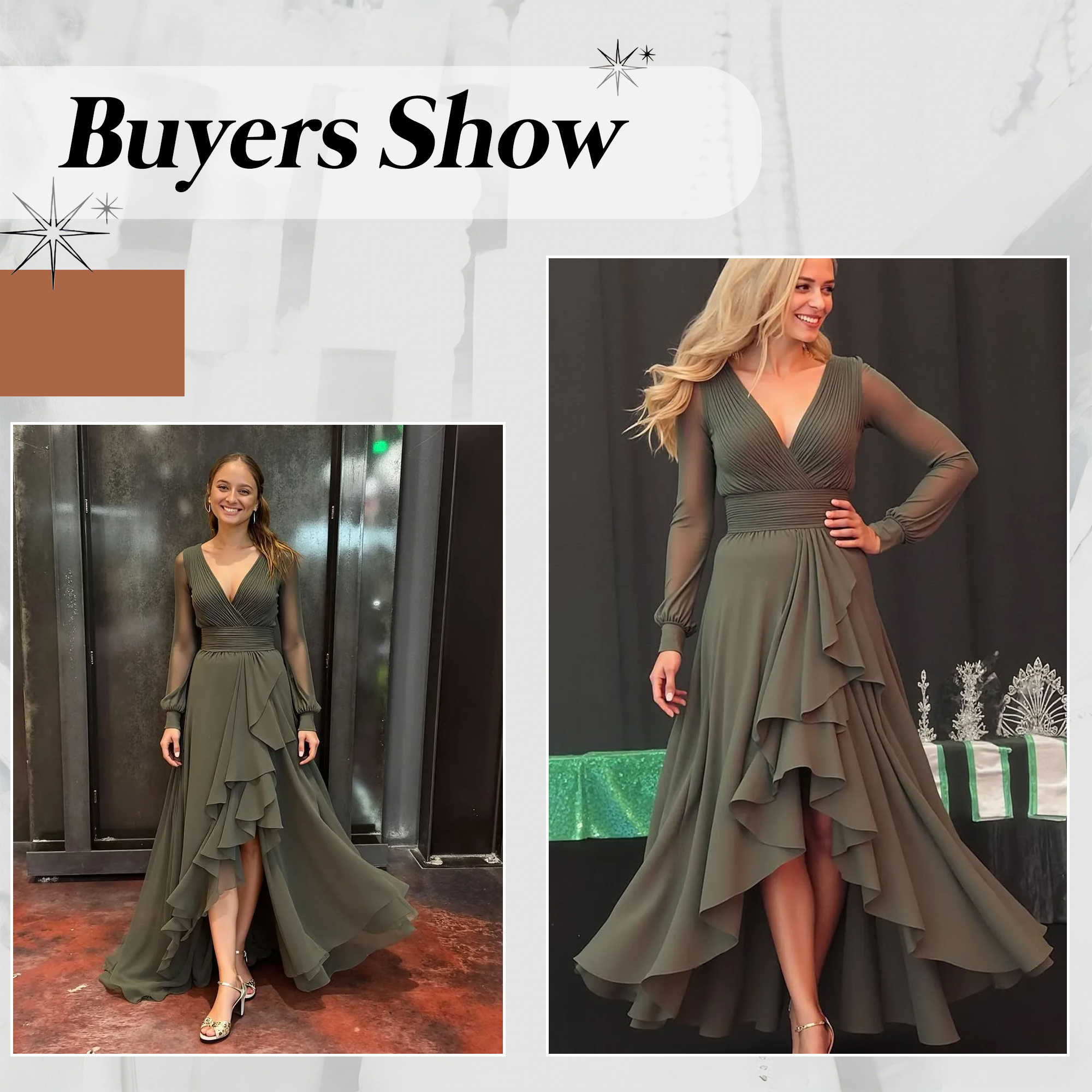 This dress offers a perfect blend of romance and modern elegance, making it an ideal choice for wedding celebrations and special occasions. The high-low hemline adds dimension and movement, allowing the skirt to float beautifully with every step while showcasing the legs in a subtle, tasteful way. Finished in a refined grey-green hue, this dress feels fresh, elegant, and versatile, perfect for garden weddings, outdoor ceremonies, or semi-formal receptions when paired with delicate heels and understated accessories.