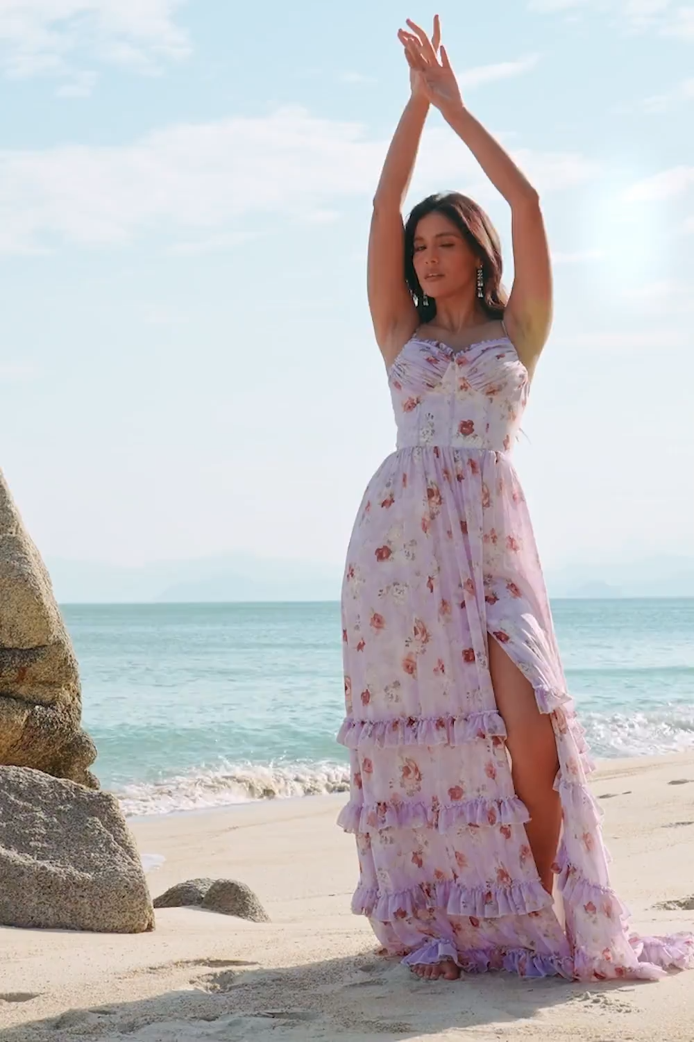 Grey Purple Floral Corset Ruffled A-Line Bridesmaid Dress with Slit