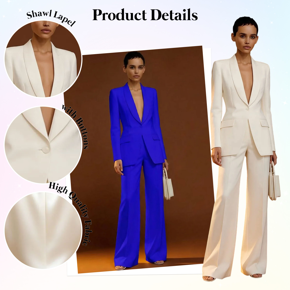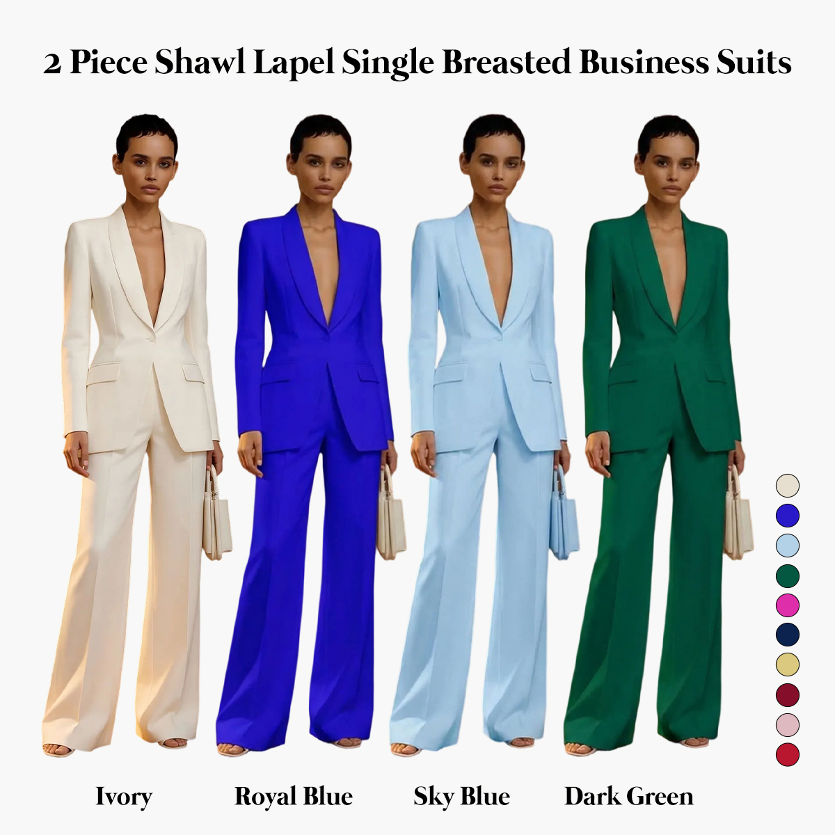 The suit is a sophisticated and elegant ensemble designed for women who appreciate polished style with a modern touch. The blazer features a smooth shawl lapel that adds a graceful and feminine detail while maintaining a structured silhouette, and the single-breasted design provides a flattering fit that subtly highlights the waist and enhances the overall figure. Versatile and stylish, this two-piece suit is ideal for modern professionals, engagement events, civil ceremonies, or any occasion where confidence and elegance are essential, making it a refined addition to any contemporary wardrobe.