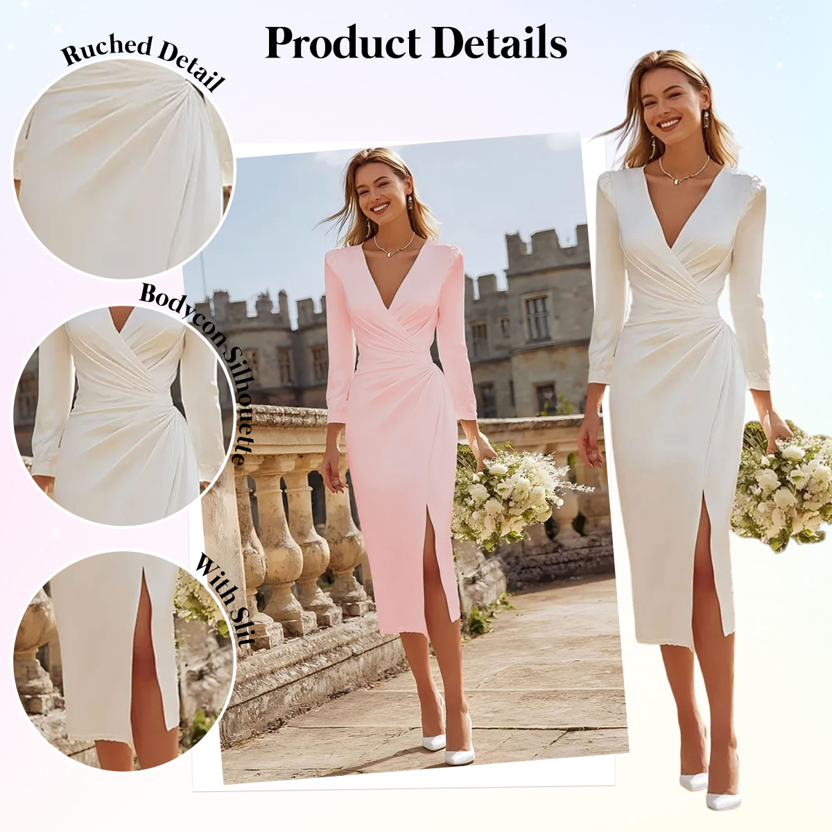 Ivory Bodycon V-Neck Ruched Midi Engagement Dress with Slit