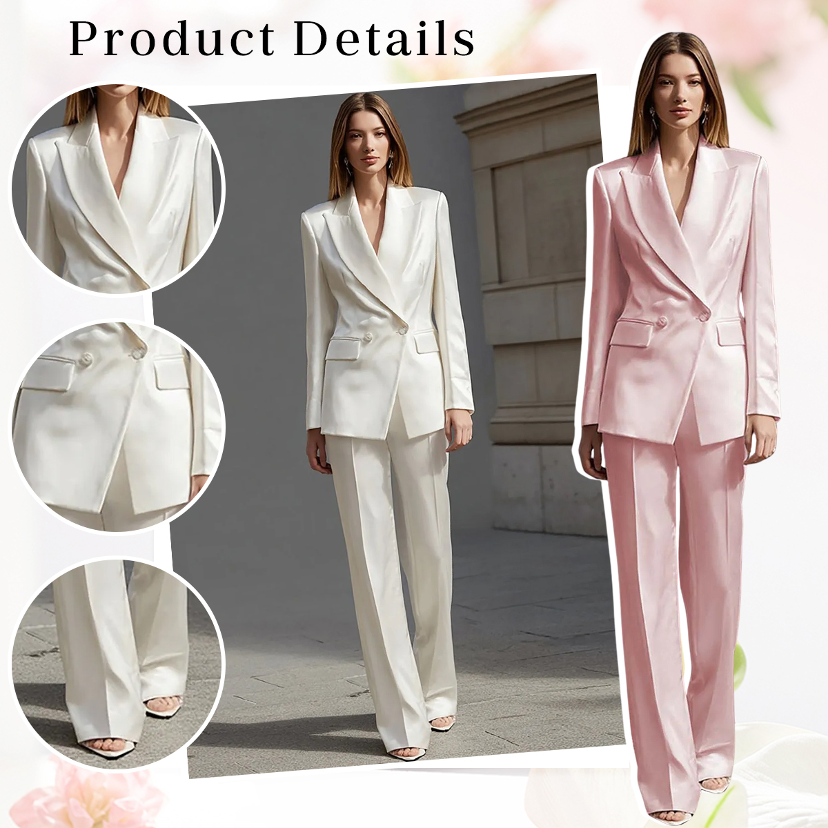 This 2-piece business suit combines sleek tailoring with a refined, modern edge. The double-breasted blazer features sharp peak lapels, structured shoulders, and a smooth satin finish that adds subtle sophistication. Designed for a flattering fit, it pairs effortlessly with tailored trousers that elongate the silhouette. The lustrous ivory hue gives the ensemble a polished yet contemporary feel, making it versatile for professional settings, formal events, or chic evening occasions. Elegant and powerful, this suit offers a perfect balance of confidence and style for those who appreciate timeless fashion with a luxurious twist.