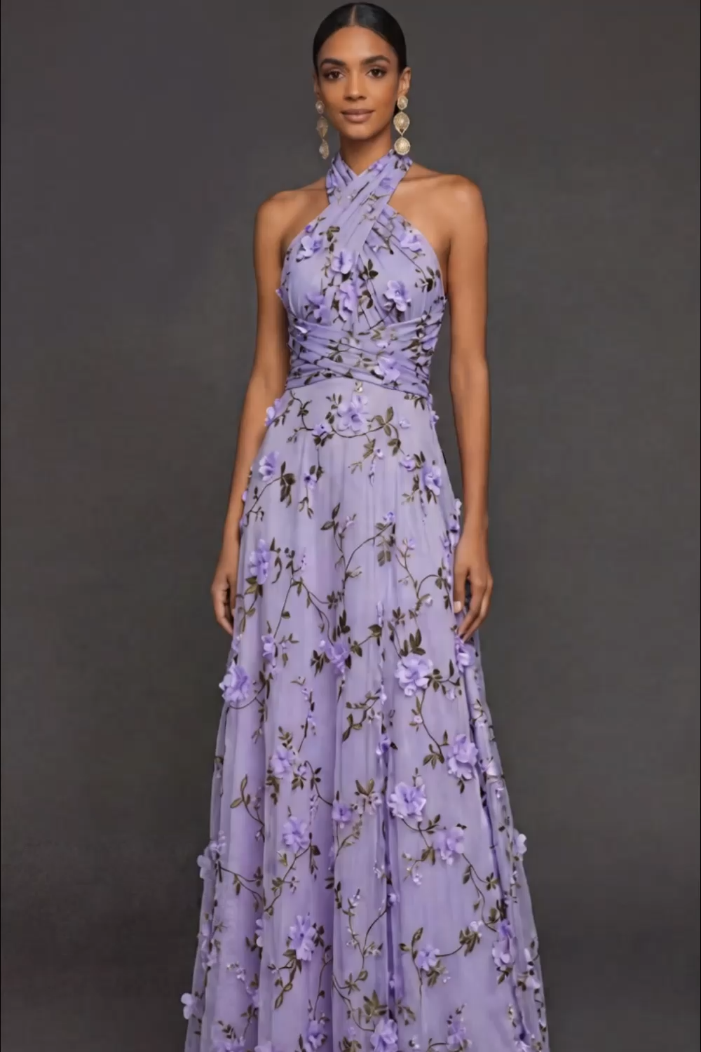 Lilac Floral A Line Halter Neck Appliqued Long Formal Dress