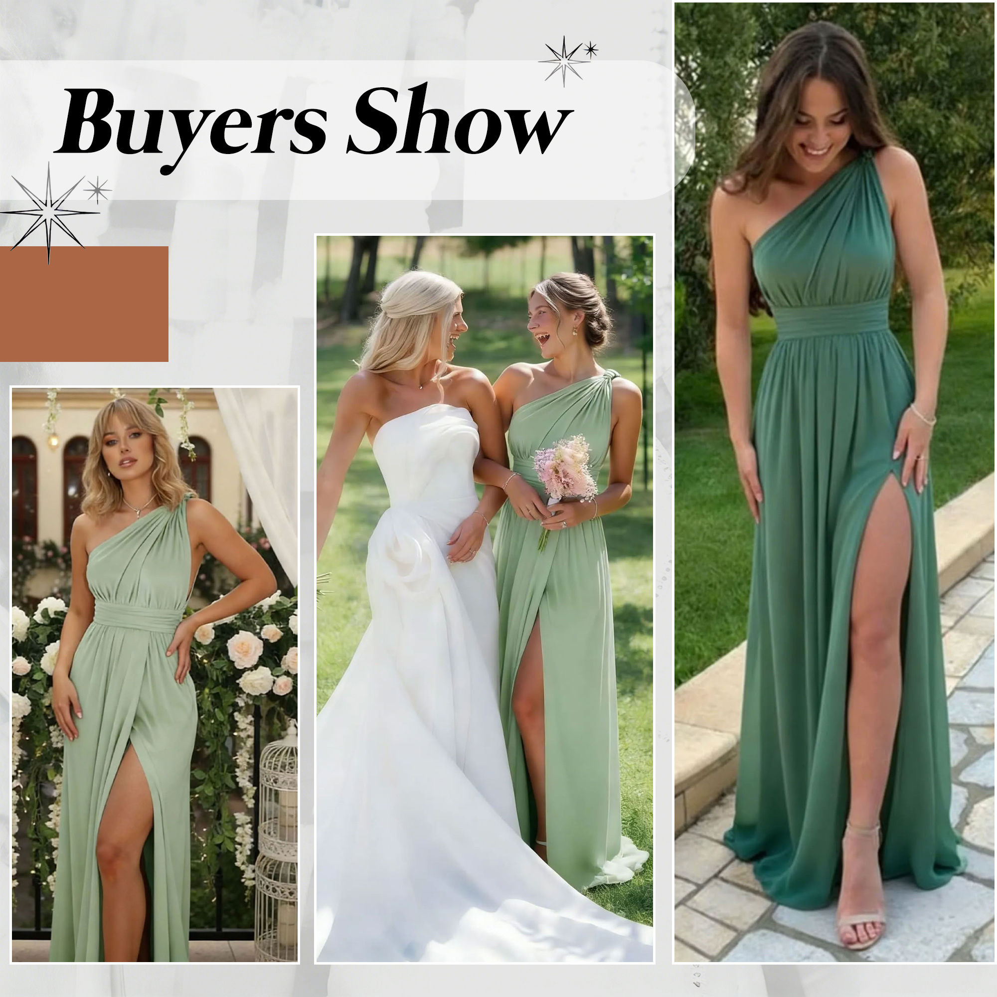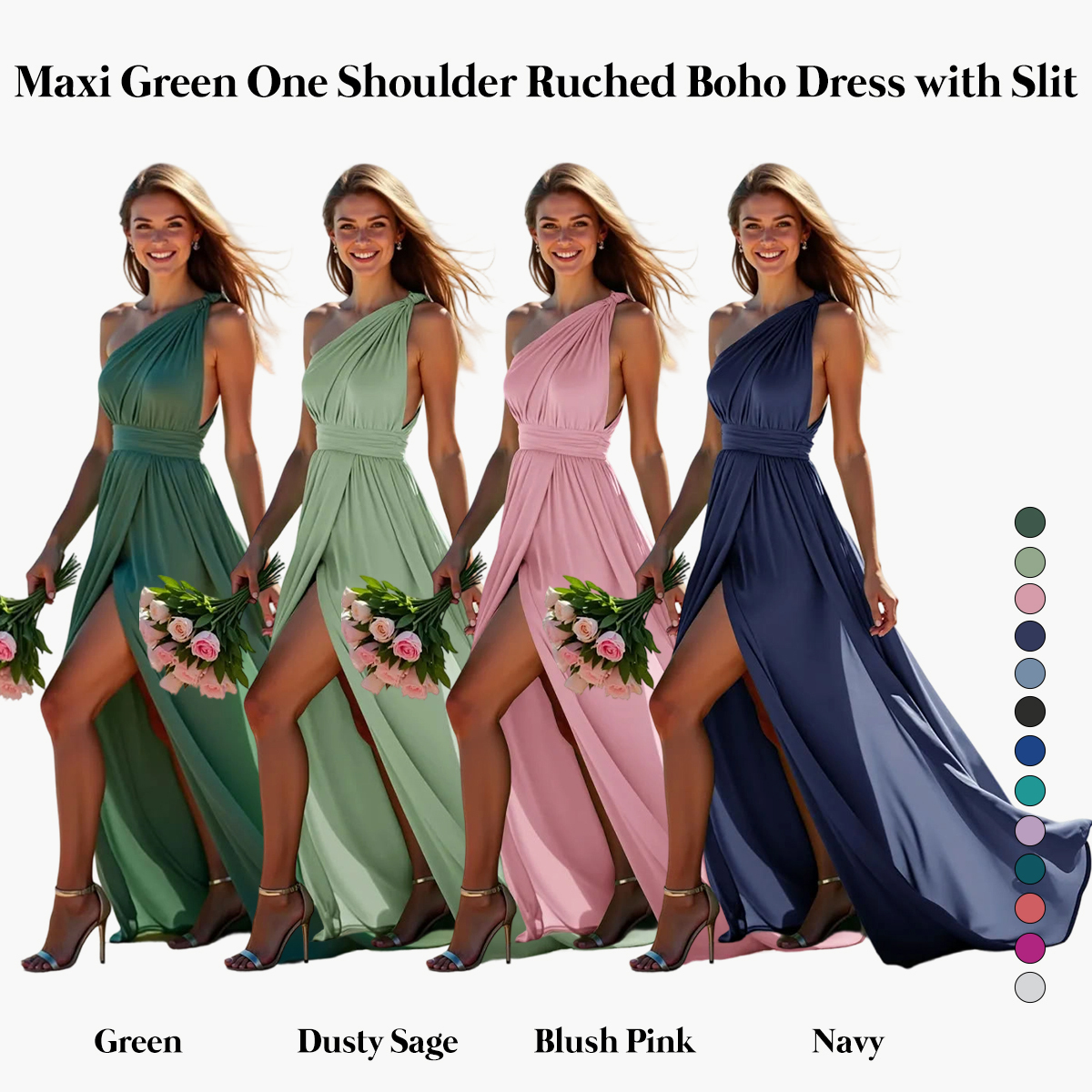 Maxi Green One Shoulder Ruched Boho Bridesmaid Dress with Slit