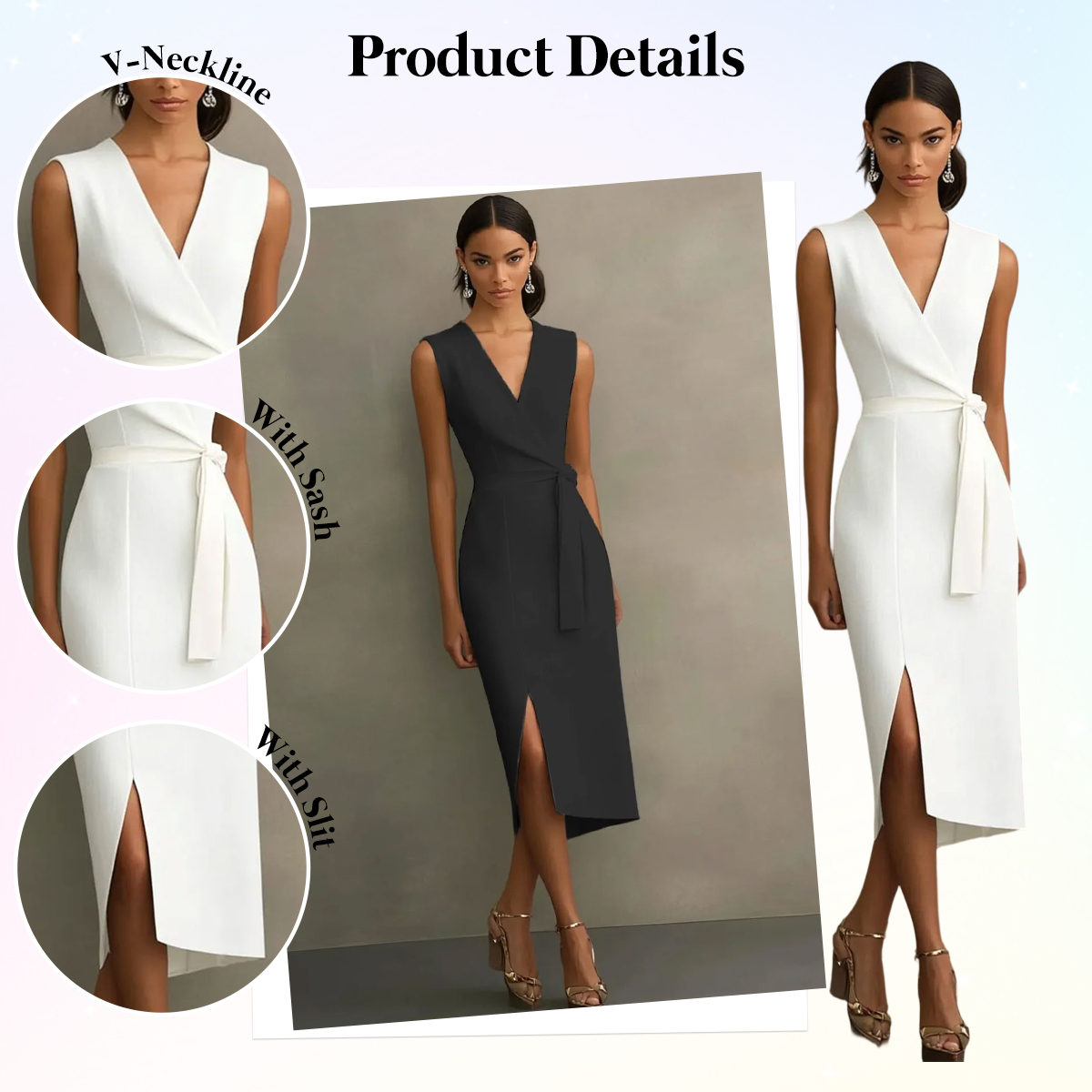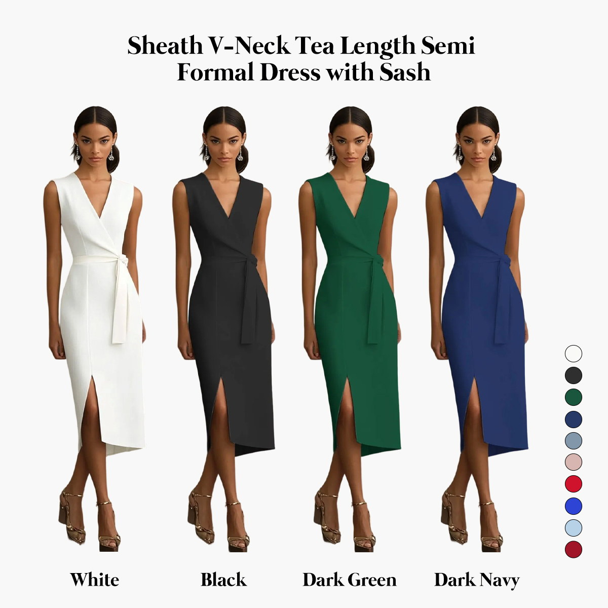 Elegant and timeless, this dress is the perfect choice for any special occasion. Crafted from smooth, high-quality fabric, the sheath silhouette gracefully skims the body, offering a flattering and refined look. The V-neckline adds a touch of sophistication, while the tea-length hem brings a classic, vintage-inspired charm. A detachable sash cinches the waist, enhancing your natural curves and allowing for a personalized fit. Ideal for bridal showers, graduation parties, or semi-formal gatherings, this dress blends simplicity and grace to create a polished, effortlessly chic appearance.
