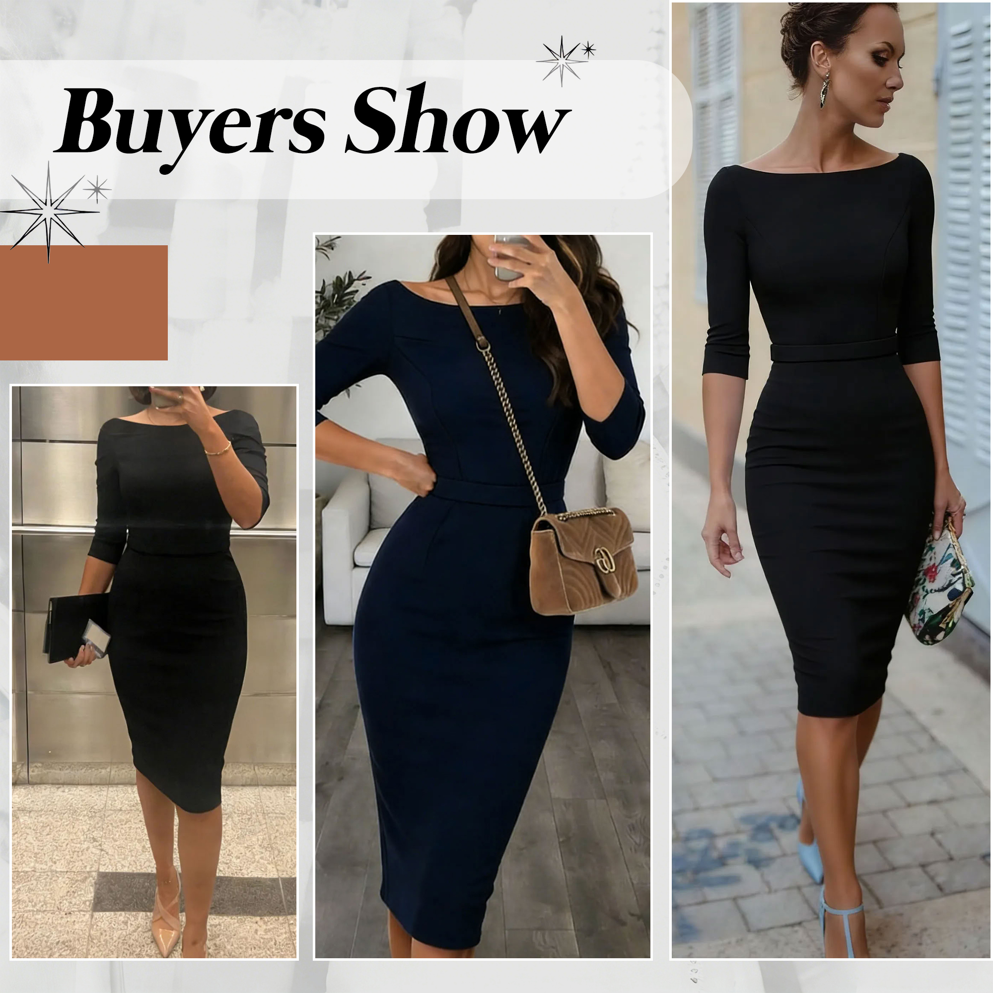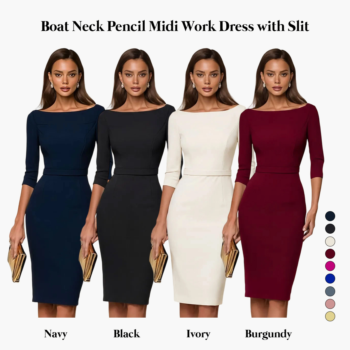 This dress delivers timeless sophistication with a modern edge. The classic navy hue creates a polished, professional look, while the elegant boat neckline highlights the shoulders and neckline with subtle grace. Designed in a fitted pencil silhouette, it flatters the figure and enhances confidence without sacrificing comfort. The midi length offers a refined and work-appropriate finish, making it ideal for office wear, meetings, and formal occasions. Effortlessly versatile, it pairs perfectly with heels and minimal accessories for a sleek, confident ensemble.