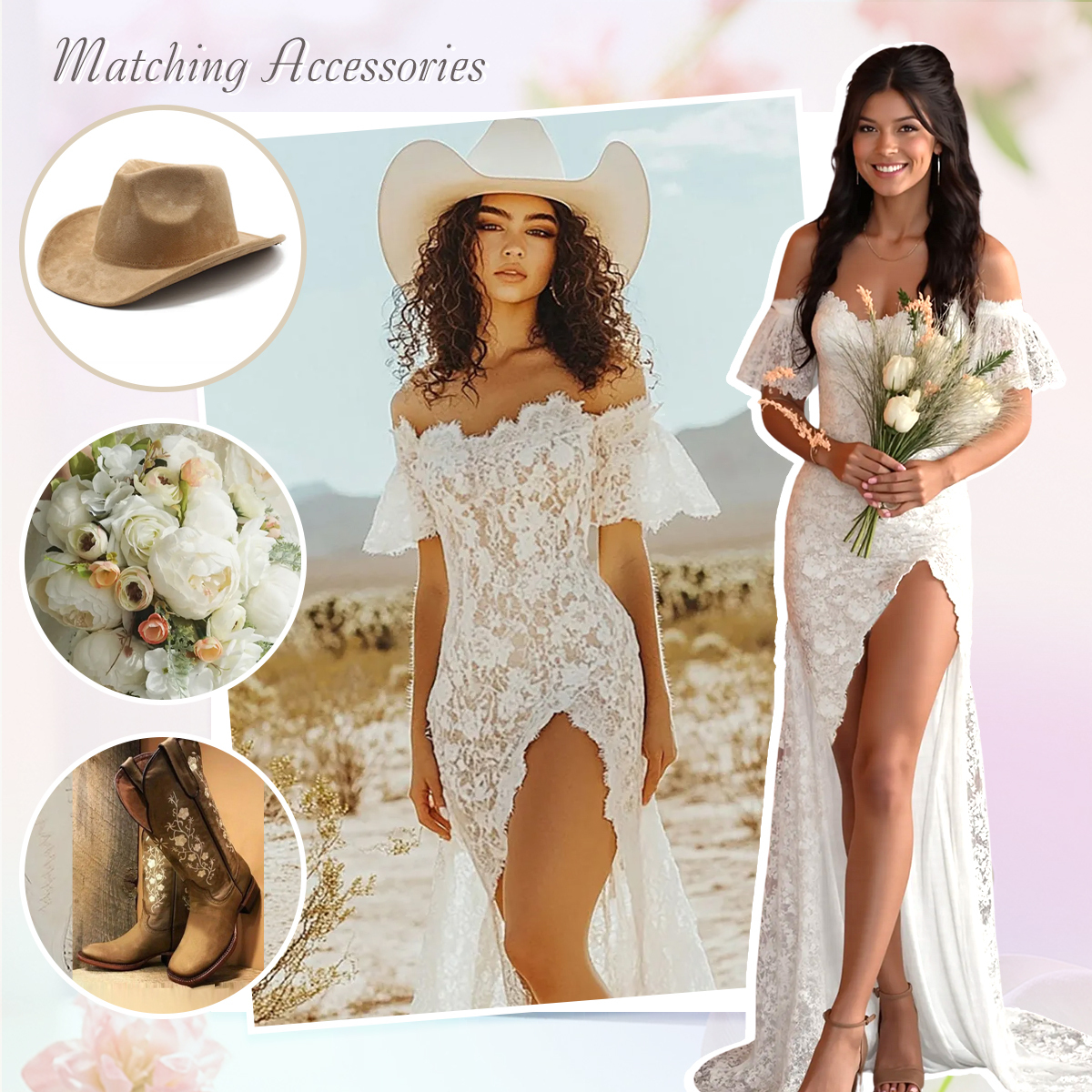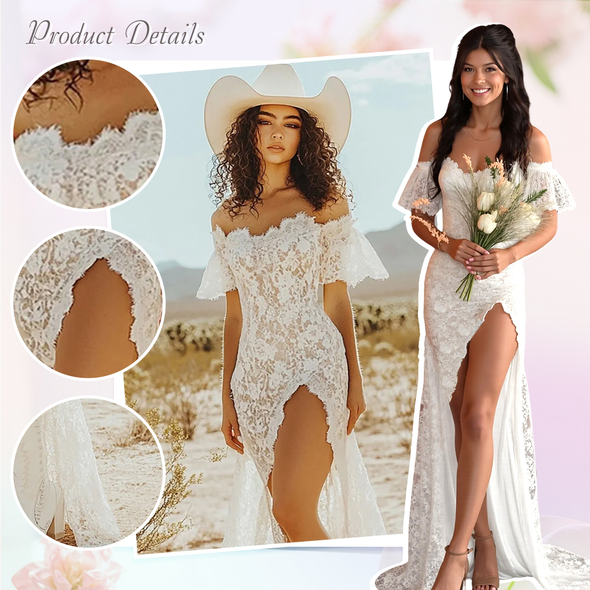 Off the Shoulder White Lace Sheath Boho Maxi Dress with Slit