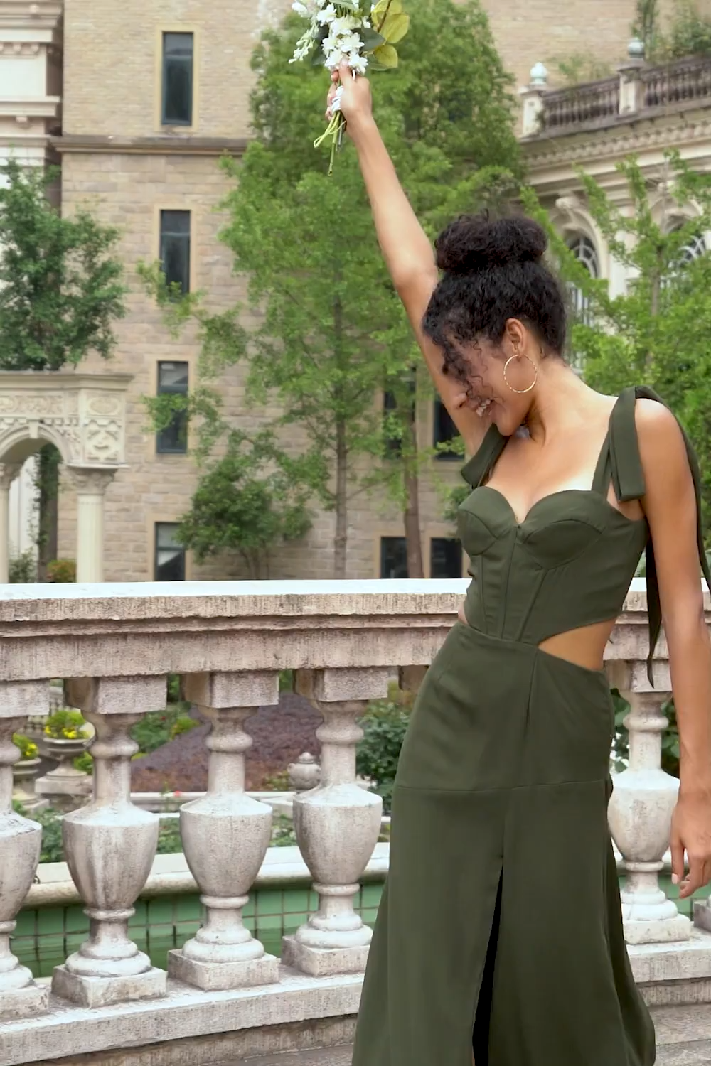 Olive A Line Spaghetti Straps Floor Length Wedding Guest Dress with Slit