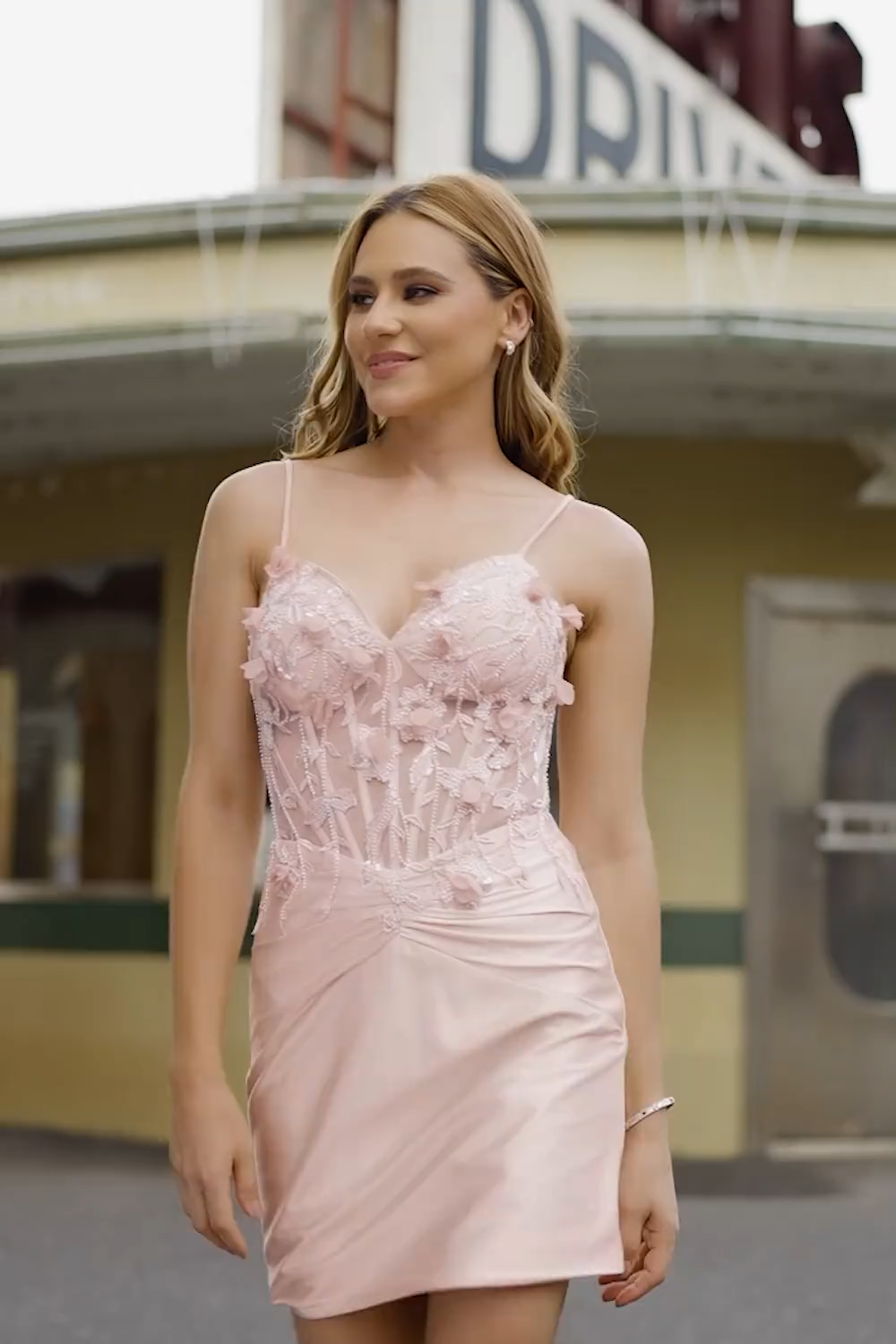 Pink Corset Satin Floral Short Tight Appliqued Homecoming Dress