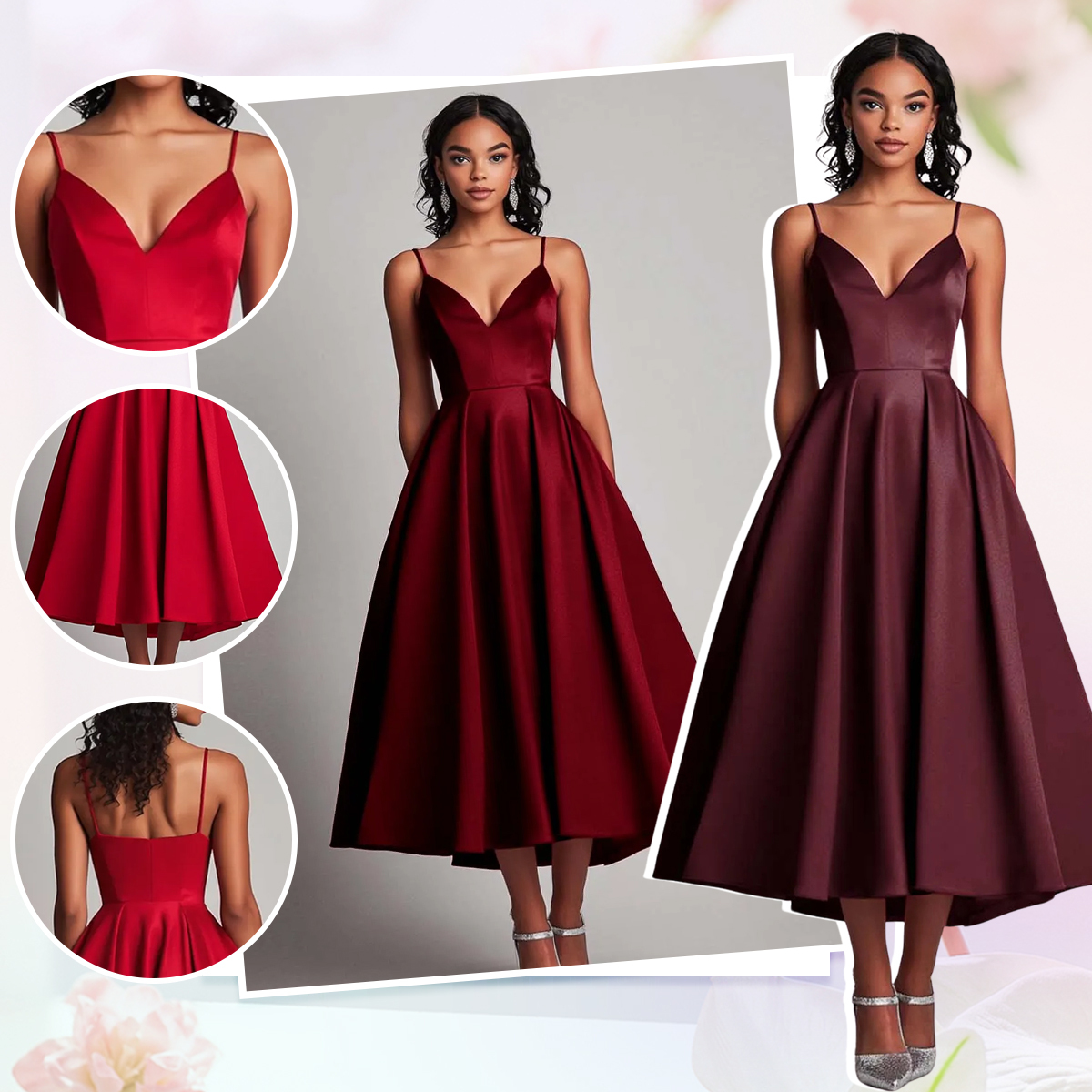 This dress exudes elegance and timeless beauty. Crafted from luxurious satin fabric, it offers a smooth, soft sheen that catches the light with every movement. The A-line silhouette is universally flattering, skimming the body while allowing for comfort and ease of movement. The delicate spaghetti straps add a touch of femininity, while the tea-length hemline creates a chic, refined look that is perfect for formal events or evening gatherings. Whether you're attending a wedding, cocktail party, or any special occasion, this dress is a stunning choice that blends classic style with modern sophistication.