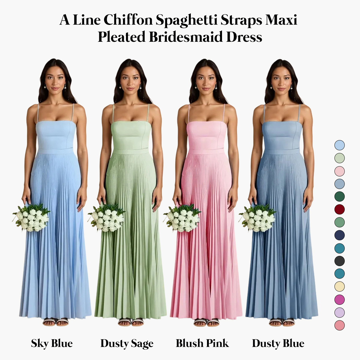 Sky Blue A Line Chiffon Spaghetti Straps Maxi Pleated Bridesmaid Dress