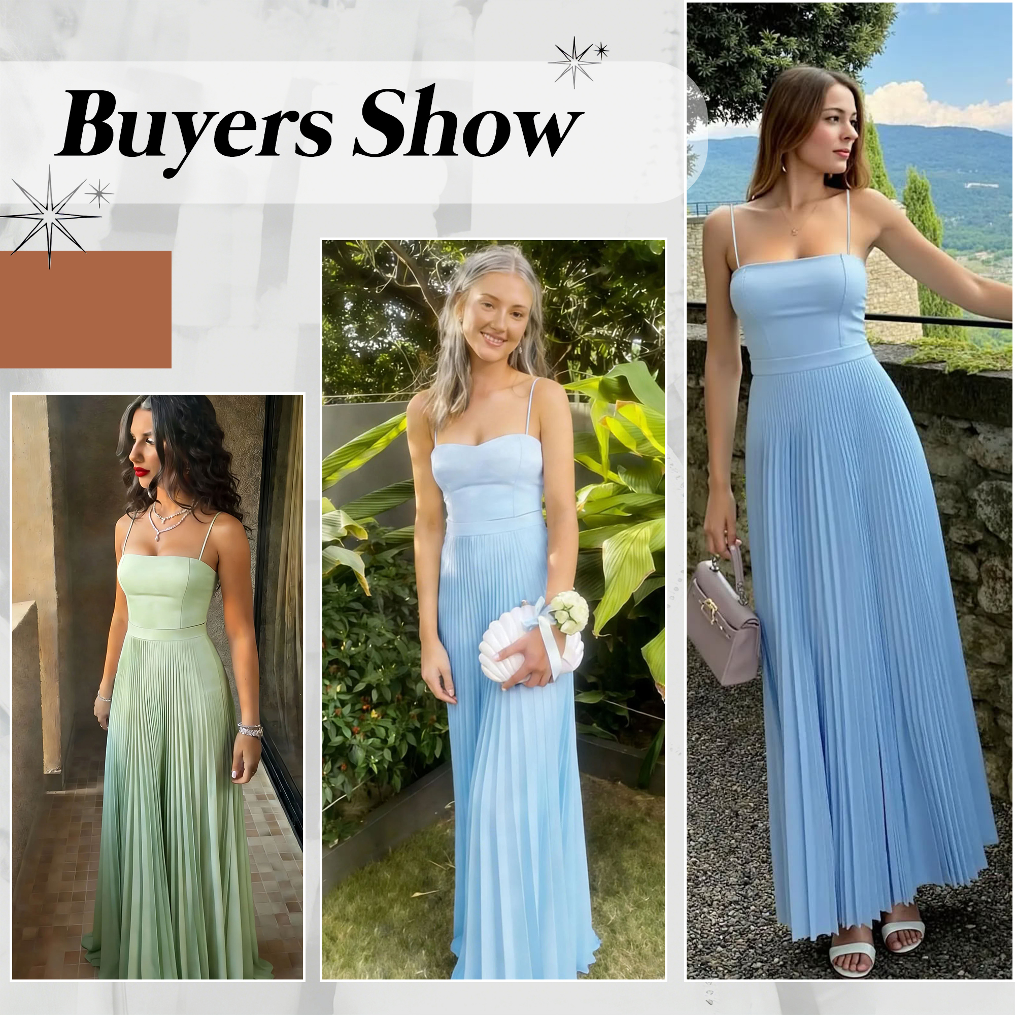 This dress is an elegant choice for any wedding or formal event. Featuring delicate spaghetti straps and a flattering A-line silhouette, it offers both comfort and style. The soft chiffon fabric flows beautifully, creating a graceful, ethereal look as it moves. Pleated detailing adds texture and dimension to the skirt, giving it a refined and sophisticated appearance. The dress's soft sky blue color exudes a sense of tranquility and freshness, making it perfect for spring and summer weddings.