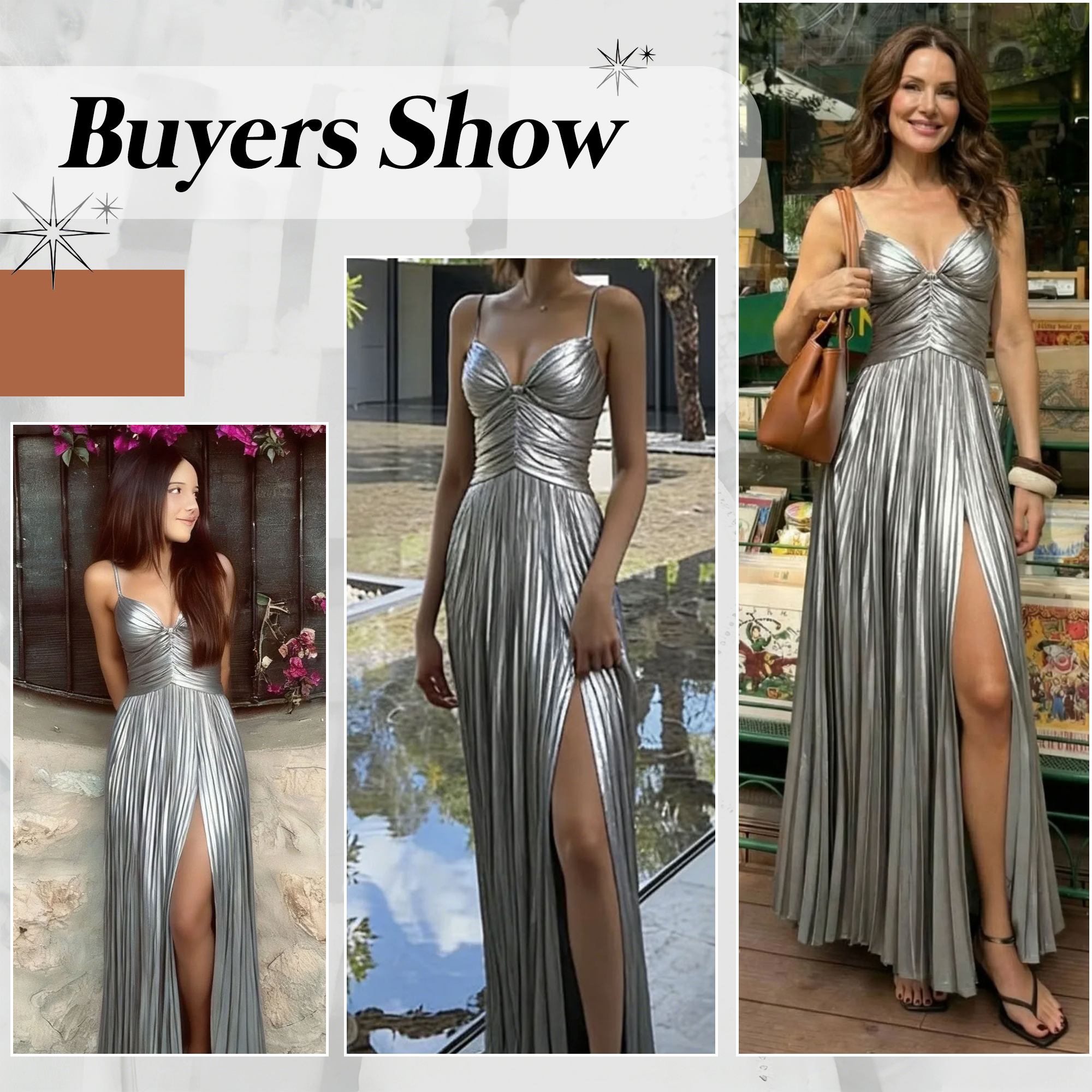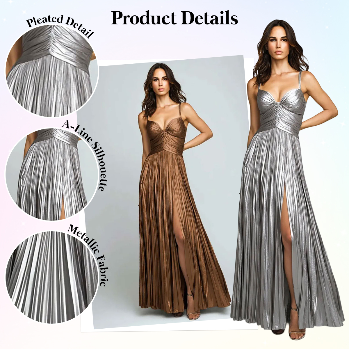 This dress exudes modern elegance with a sleek, luminous finish. Crafted from metallic pleated fabric, it reflects light beautifully, creating a refined shimmer with every step. The delicate spaghetti straps and softly draped neckline highlight the shoulders and neckline, while the flowing floor-length silhouette elongates the figure. A tasteful side slit adds movement and a hint of allure, balancing sophistication with subtle drama. Perfect for evening parties, formal events, weddings, or galas, this silver gown is a timeless choice for a polished and glamorous look.