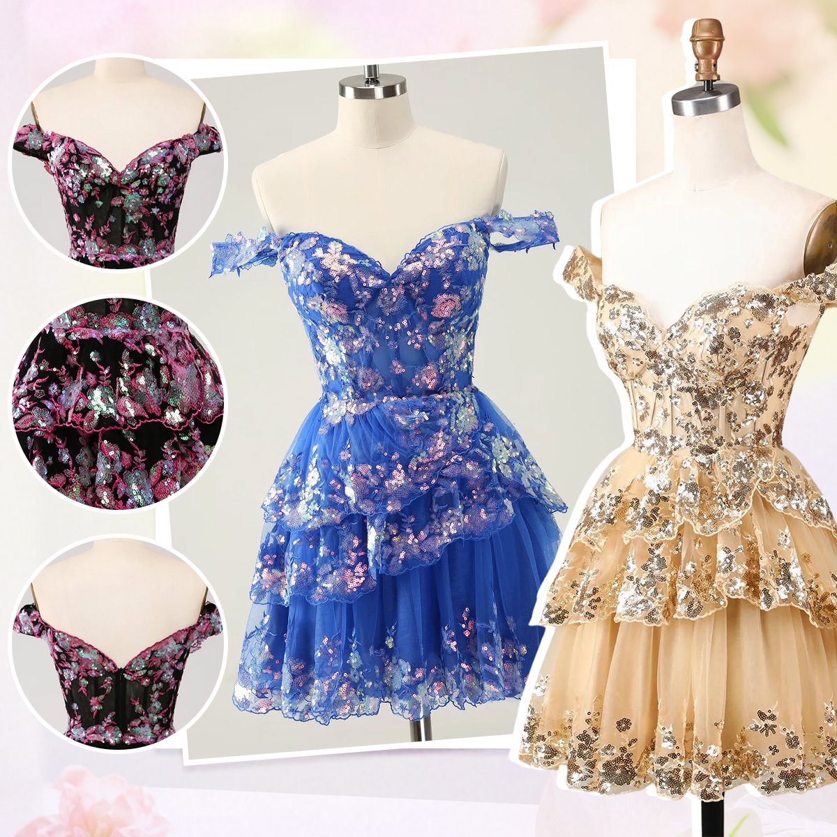 Sparkly Black Pink Corset Tiered Lace A-Line Short Homecoming Dress