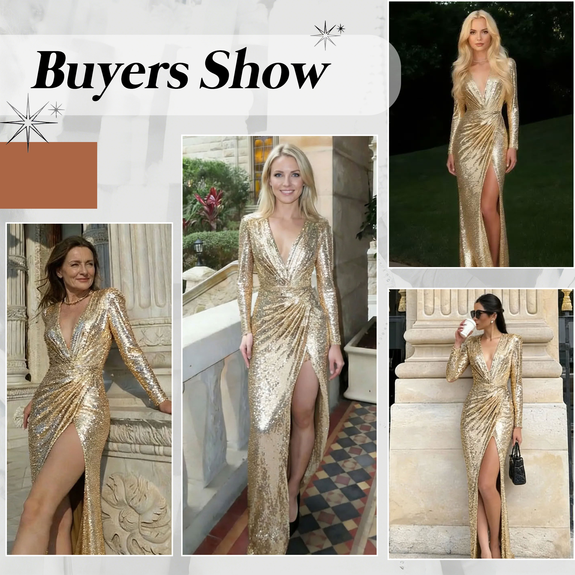 This sparkly dress features a radiant light gold sequin finish that shimmers elegantly under the light. The flattering V-neckline enhances the feminine silhouette, while the floor-length maxi cut creates a graceful and elongated look. A subtle side slit adds movement and a touch of allure without compromising sophistication. Perfect for formal evenings, weddings, galas, or special occasions, this dress balances timeless elegance with modern glamour, making it an effortless statement piece for any memorable event.